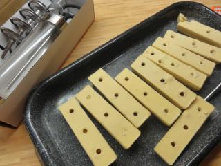 Vejce rozbijeme a oddělíme žloutky od bílků. Ke žloutkům přidáme co nejjemnější, prosátý moučkový cukr. Cukr musí být jemný, aby se při šlehání dokonale rozpustil. Nedokonale rozpuštěný by klesal ke dnu formičky. Hmota musí být hodně pevná, z vařečky stéká a řetízkuje jako med. Ke konci šlehání přidejte vanilkový cukr. Tvořítka vymažte tenkou vrstvou ztuženého tuku a hmotu nastříkejte pomocí cukrářského pytlíku do poloviny formičky. Naplněné formičky vyskládejte na plech.