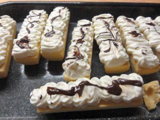 Rakvičky plňte těsně před podáváním pevně ušlehanou smetanou ke šlehání. Je možné použít ztužovač, já ho vynechávám. Smetanu můžete, ale nemusíte osladit. Částí šlehačky naplňte korpus (vytvořenými otvory) a zbytek ozdobně nasříkejte nahoru. Použijte řezanou cukrářskou špičku.